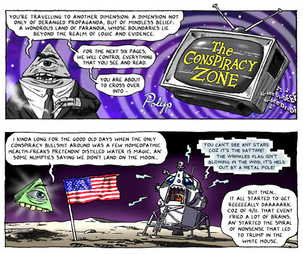 A short, visually dense minicomic that takes an enraged, scatalogical and sarcastically debunking journey into the sinister, alt-right heart of the conspiracy theory movement.